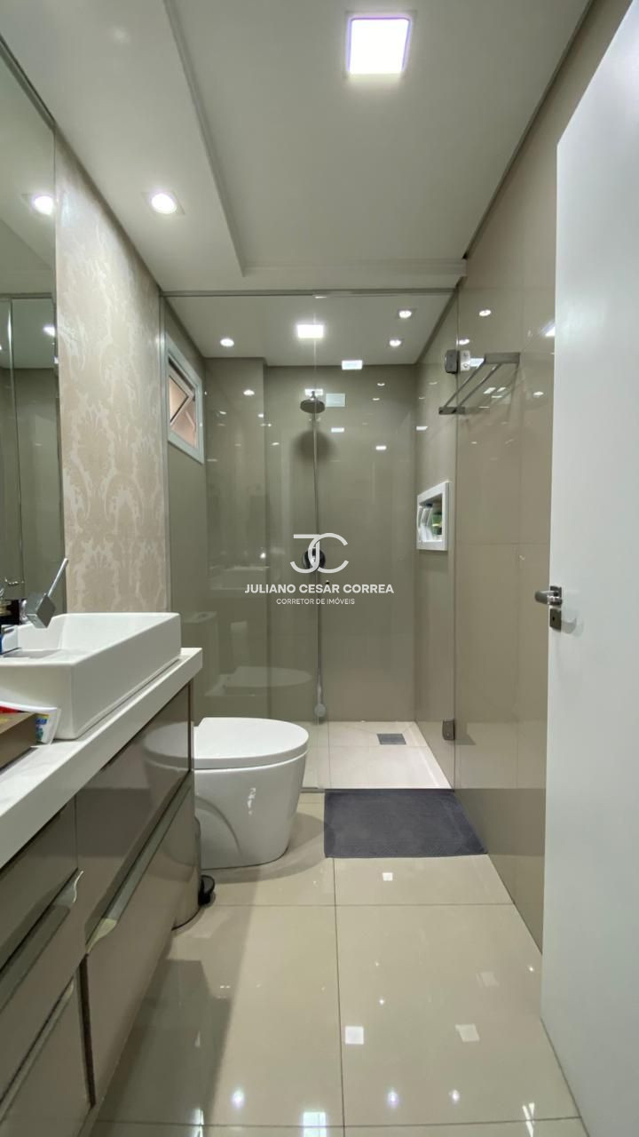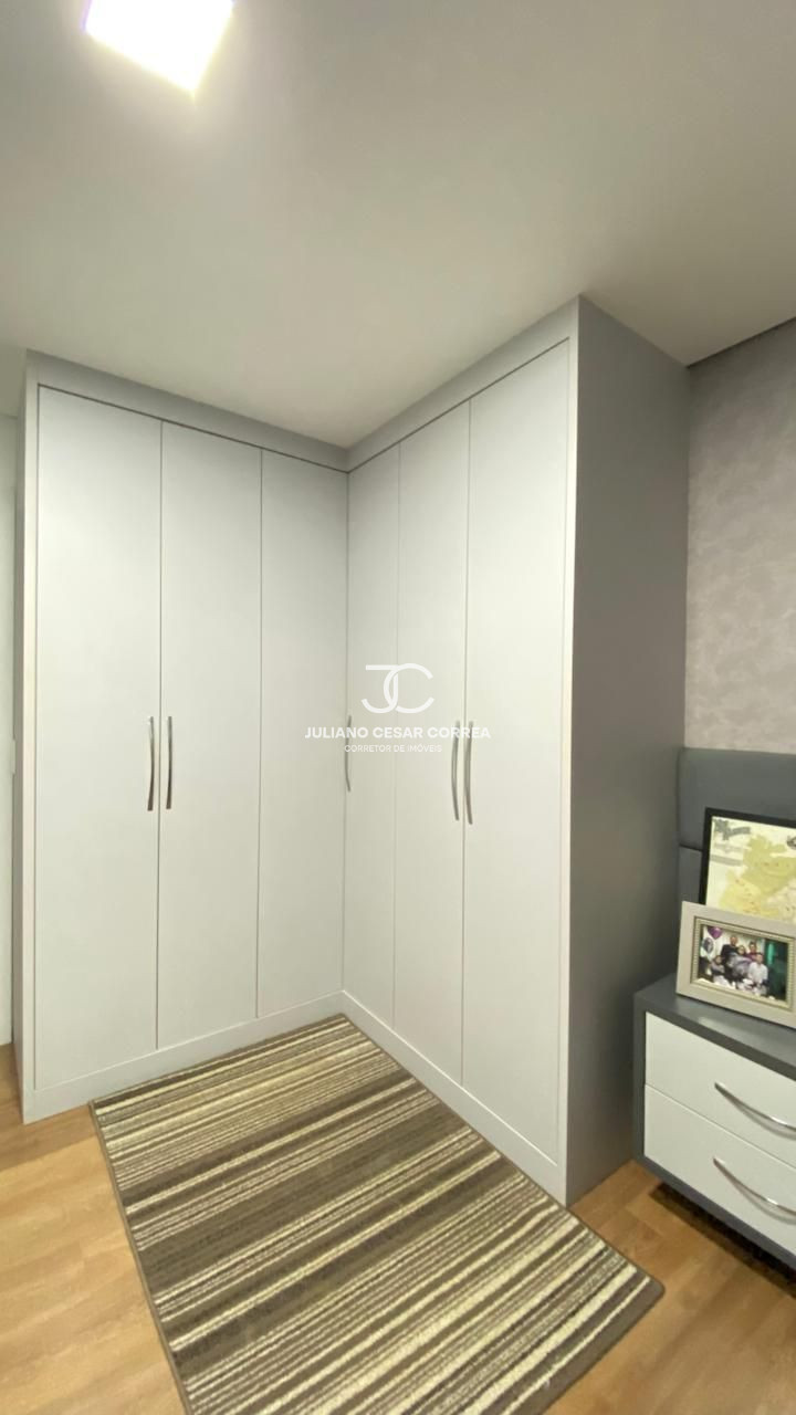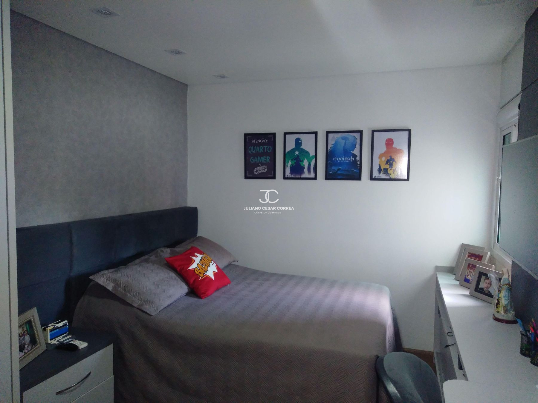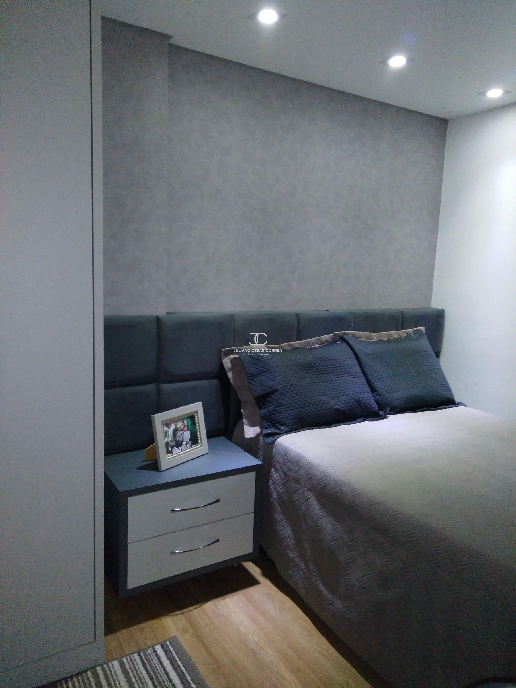 Suíte: cabeceira de cama, criado mudo, escrivaninha com armário aéreo, closet planejado, ar condicionado.
